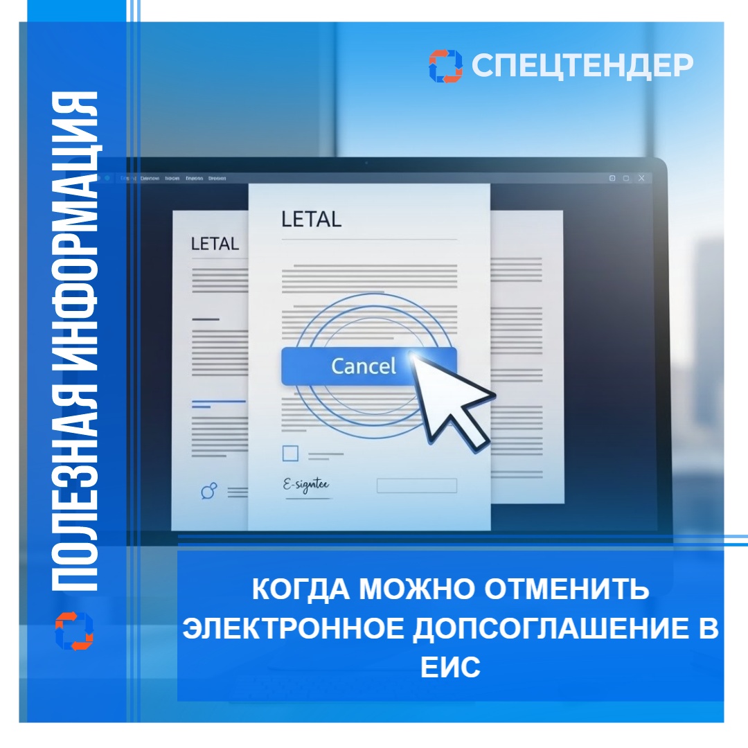 Когда можно отменить электронное допсоглашение в ЕИС18.02.2026Отменить процедуру заключения электронного дополнительного соглашения возможно только на этапах «Подписание заказчиком» и «Подписание поставщиком». Для этого размещается документ «Информация об отмене процедуры заключения доп. соглашения». Со стороны заказчика отмена осуществляется через активную ссылку «Отменить процедуру заключения доп